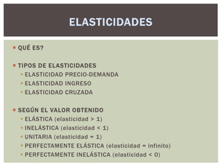 El documento aborda los tipos de elasticidades en economía, incluyendo elasticidad precio-demanda, elasticidad ingreso y elasticidad cruzada, así como sus clasificaciones. Se explican factores que determinan la elasticidad de la demanda, como la necesidad del bien, la existencia de sustitutos y el horizonte temporal. Además, se incluyen fórmulas para calcular las elasticidades y sus implicaciones en el ingreso total.