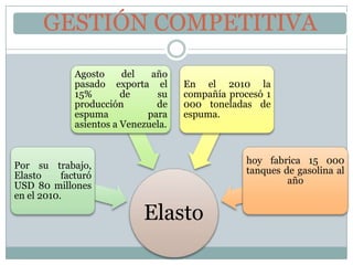 Este documento resume la información de la empresa Elasto S.A., incluyendo sus estrategias, alianzas y modalidad de producción "Justo a Tiempo". Describe los diversos productos que fabrica como recubrimientos, asientos, tanques de combustible y accesorios para automóviles. Concluye que es una empresa competitiva a nivel internacional gracias a su alta calidad, alianzas estratégicas y modelo de producción flexible.