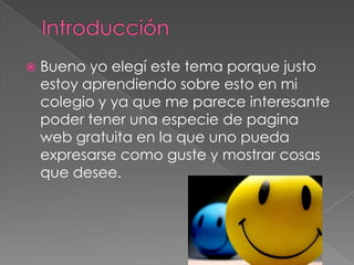 El documento describe los blogs, incluyendo su historia, características y usos. Un blog es un sitio web actualizado periódicamente donde uno o más autores publican artículos y comentarios de manera cronológica. Los primeros blogs aparecieron en la década de 1990 como diarios personales en línea. Actualmente, los blogs son uno de los servicios más populares en Internet y son usados por individuos, comunidades y empresas para compartir información.