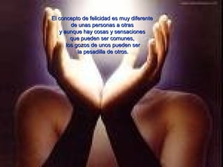 La felicidad es subjetiva y diferente para cada persona; lo que hace feliz a unos puede ser una pesadilla para otros. La felicidad depende más de la perspectiva interna y las actitudes hacia uno mismo y la vida que de factores externos. Al buscar dentro de uno mismo, siempre se pueden encontrar razones tanto para la felicidad como para la tristeza; la verdadera felicidad proviene de estar a gusto con uno mismo y disfrutar de la vida.