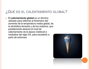 El documento habla sobre el calentamiento global. Explica que es un aumento de la temperatura promedio de la Tierra causado principalmente por las emisiones de gases de efecto invernadero producidas por las actividades humanas. Algunas consecuencias incluyen el derretimiento del hielo polar, el aumento del nivel del mar y un mayor riesgo de enfermedades. También menciona acciones que las personas pueden tomar para reducir su huella de carbono y mitigar el problema.