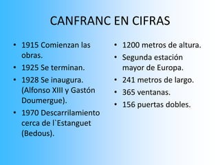 La estación internacional de Canfranc fue inaugurada en 1928 para conectar Madrid y París a través de una línea férrea que atravesaba los Pirineos. En 1970, un descarrilamiento cerca de la frontera francesa llevó al cierre de la línea por parte de Francia. Actualmente, el tramo entre Zaragoza y Huesca está electrificado pero la sección entre Huesca y la frontera francesa permanece cerrada desde 1970, a excepción de un pequeño tramo en Francia. Se están realizando esfuerzos para