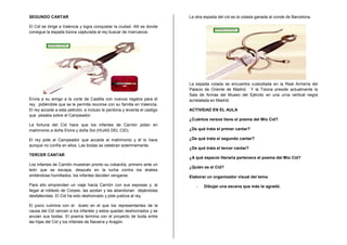 El Cantar de Mio Cid es un poema anónimo del siglo XII que narra las hazañas heroicas de Rodrigo Díaz de Vivar. Consta de tres cantares: el primero describe el destierro injusto del Cid de Castilla; el segundo, cómo conquista Valencia y recupera el honor; y el tercero, cómo sus yernos los Infantes de Carrión deshonran a sus hijas, por lo que el Cid busca venganza en un juicio por combate.