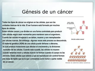 El documento describe el cáncer, incluyendo su origen a nivel celular, los principales tipos, causas como exposición a carcinógenos y factores de riesgo como el tabaco y la dieta, así como métodos de prevención como evitar el tabaco y mantener una dieta equilibrada y tratamientos que pueden incluir cirugía y quimioterapia.