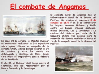 El combate naval de Angamos, ocurrido el 8 de octubre de 1879 durante la guerra del Pacífico, enfrentó a los buques peruanos Huáscar y Unión contra la escuadra chilena. La captura del Huáscar, donde falleció el almirante Miguel Grau, fue crucial para el dominio marítimo chileno y marcó el fin de la campaña naval. El monitor Huáscar se conserva hoy como un museo en Talcahuano, recordando el sacrificio de Grau y su tripulación.