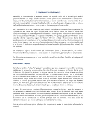 Este documento describe los diferentes niveles de conocimiento: empírico, científico, filosófico y teológico. El conocimiento empírico se obtiene por experiencia cotidiana y es práctico pero no teórico. El conocimiento científico va más allá del empírico al explicar fenómenos por sus causas y leyes de forma objetiva y sistemática. El conocimiento filosófico se enfoca en realidades no perceptibles y busca comprender la realidad de forma universal. El conocimiento teológico es revelado por