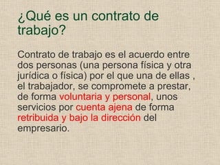 El documento describe los diferentes tipos de contratos de trabajo en España. Menciona contratos indefinidos como el ordinario y de fomento, y contratos temporales como formativos, causales para obra/servicio determinado, eventuales, de interinidad y relevo. Explica requisitos, duración, forma y extinción de cada uno. También cubre aspectos generales como elementos, personas que intervienen, contenido mínimo y nulidad del contrato.