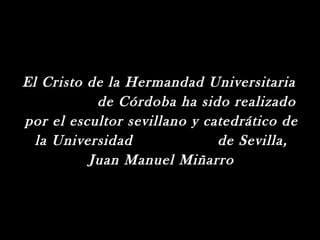 El Cristo de la Hermandad Universitaria de Córdoba es una escultura que representa a Jesucristo crucificado con un alto nivel de detalle anatómico y fisiológico, basado en los estudios científicos de la Sábana Santa de Turín. La escultura muestra los politraumatismos visibles en la Sábana Santa con gran precisión.