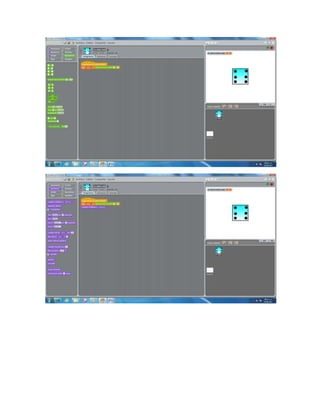 Este documento proporciona instrucciones paso a paso para crear un dado virtual en Scratch. Explica cómo dibujar un cubo, copiarlo 6 veces para representar los lados de un dado, agregar puntos en cada cara, nombrar el objeto como "dado", importar un botón para tirar el dado, programar el dado para cambiar de cara al presionar el botón, y duplicar el dado 4 veces para colocarlos en las esquinas de la pantalla. El objetivo es crear una simulación simple de un dado que pueda ser tirado virtualmente.