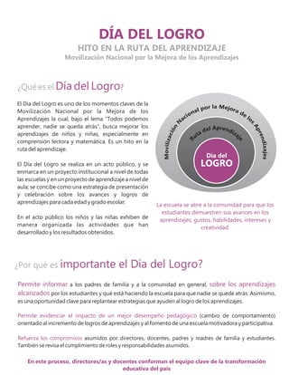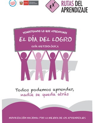 El documento describe la Movilización Nacional por la Mejora de los Aprendizajes y el Día del Logro, que es un hito en la ruta del aprendizaje. El Día del Logro es un acto público donde los estudiantes exhiben sus avances en aprendizaje y se celebran los progresos. Se lleva a cabo dos veces al año y involucra a directores, docentes, padres y estudiantes trabajando juntos para mejorar la comprensión lectora y las matemáticas.