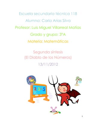 Este documento resume la historia de "El Diablo de los Números". Cuenta la historia de Robert, un niño que cambió drásticamente ya que ahora solo pensaba en matemáticas. Cada noche soñaba con un amigo llamado Templotaxl que le revelaba secretos numéricos. Finalmente fue invitado a cenar al "Infierno de los Números" donde conoció a importantes matemáticos. Aunque ya no ve al diablo, Robert se ha convertido en un gran matemático y valora esta ciencia.