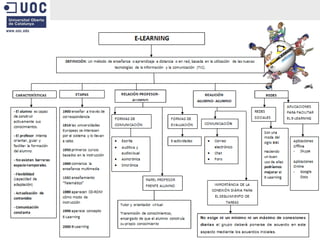 El documento resume las características del E-learning, incluyendo su definición, evolución, métodos de comunicación entre profesores y alumnos, el rol del profesor, formas de evaluación, relaciones entre alumnos y el uso de redes sociales. Concluye que aunque ambos tipos de enseñanza son importantes, el E-learning ha permitido que más personas accedan a la educación continua.