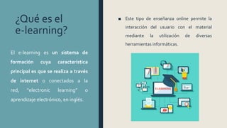 El documento describe el e-learning o aprendizaje electrónico, que permite la interacción del usuario con materiales educativos a través de herramientas informáticas e Internet. El e-learning tiene características como simplicidad de uso, sistemas multimedia, accesibilidad y capacidad de eliminar distancias. Ofrece ventajas como reducción de costos, inmediatez y flexibilidad. También causa cambios en la educación como centrarse más en el alumno, fomentar la autoformación y trabajo en grupo, y crear nuevos perfiles profes