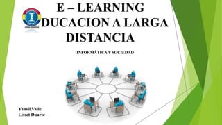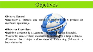 Este documento describe el E-Learning o educación a distancia mediante el uso de tecnologías. Define E-Learning y explica que surgió en 1840 con cursos por correspondencia en Gran Bretaña. Detalla las características como la flexibilidad del tiempo y lugar de estudio y cómo pone una amplia cantidad de información a disposición de los estudiantes. También analiza las ventajas como la actualización de contenidos y desventajas como requerir habilidades de aprendizaje autónomo.
