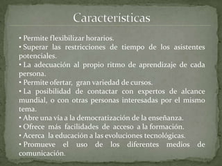 El E-Learning permite flexibilizar los horarios de aprendizaje y superar las restricciones de tiempo, permitiendo que cada persona aprenda a su propio ritmo. Ofrece una gran variedad de cursos y la posibilidad de conectar con expertos de todo el mundo. Abre el acceso a la educación y promueve el uso de medios de comunicación, democratizando la enseñanza. Se caracteriza por la separación entre profesor y alumno, permitiendo grupos más grandes con menores costos, horarios flexibles y comunicación bidireccional, a diferencia