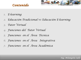 El documento describe las diferencias entre la educación tradicional y la educación en línea (e-learning), y las funciones de un tutor virtual. Explica que la educación en línea permite a estudiantes y profesores participar desde cualquier lugar, utiliza recursos en línea para publicar clases y generar discusiones, y evalúa a través de trabajos de investigación y foros. También detalla que las funciones de un tutor virtual incluyen dar apoyo técnico, mantener la participación, y dominar los temas académicos, la estructura de contenido