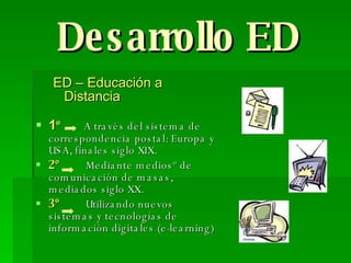 El documento describe la evolución del e-learning desde el siglo XIX hasta la actualidad, cuando se utilizan nuevas tecnologías digitales. Define el e-learning como un conjunto de métodos y tecnologías para facilitar el aprendizaje a distancia a través de Internet. Señala que el e-learning ofrece flexibilidad, acceso universal y respeta el ritmo individual del estudiante, pero requiere autonomía por parte del estudiante y competencias tecnológicas tanto de estudiantes como profesores.