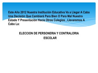 El documento describe la elección de un personero y contralor escolar que se llevará a cabo este año. Los estudiantes votarán por Carolina Rojas o Andrés Ladino como personero, y por Anderson Camacho, Jhordy Rivera, Miguel o Daniel como contralor. El personero velará por los derechos de los estudiantes, mientras que el contralor supervisará el uso adecuado del dinero de la institución.