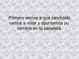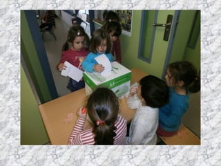 Los estudiantes eligen a sus representantes de clase. Primero deciden por quién votar y escriben su nombre en la papeleta. Luego constituyen la mesa electoral y procede la votación, terminando los miembros de la mesa. Finalmente, las elegidas celebran su victoria.