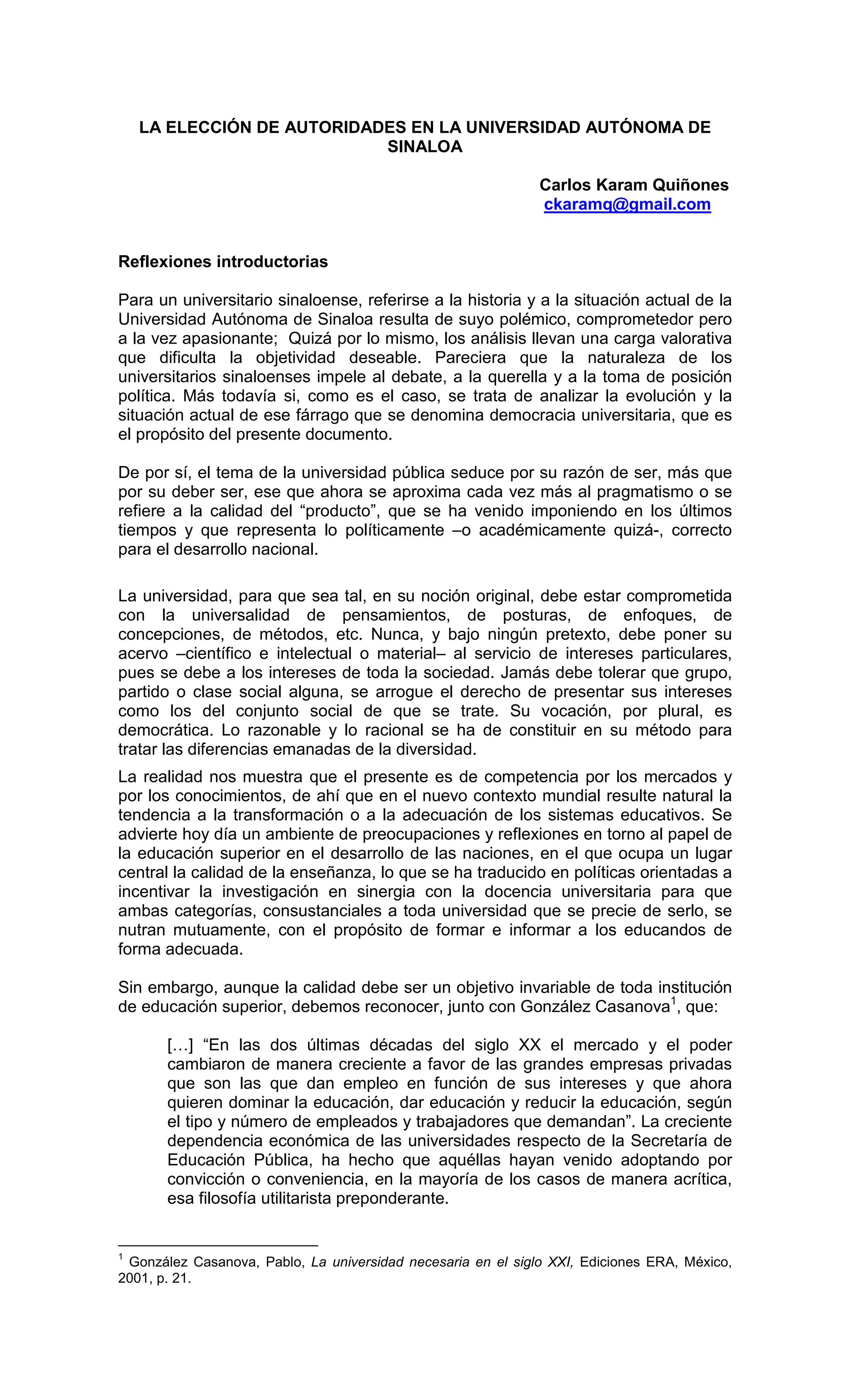 El documento describe la evolución y situación actual de la democracia universitaria en la Universidad Autónoma de Sinaloa. Comenzó en 1873 como el Liceo Rosales en Mazatlán, y desde entonces ha pasado por varios cambios en sus procesos de elección de autoridades. Actualmente existe un debate sobre el balance entre la calidad académica y la democracia en la universidad, y sobre cómo la institución puede cumplir su misión de servir a toda la sociedad.