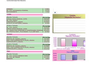 El documento presenta resultados electorales de diferentes provincias argentinas. Muestra los porcentajes obtenidos por diferentes alianzas y partidos políticos en las elecciones para diputados y senadores nacionales y provinciales en cada provincia.