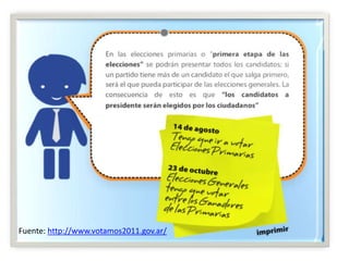 Este sitio web proporciona información sobre las elecciones de 2011 en Argentina, incluidos detalles sobre cómo y dónde votar, así como los candidatos y partidos políticos participantes.