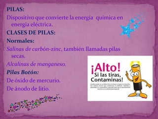 Este documento describe diferentes fuentes de alimentación directa como pilas, baterías, fuentes de voltaje y los tipos de corriente eléctrica. Explica que las pilas convierten energía química en eléctrica y enumera pilas normales y pilas botón. Luego describe las diferentes clases de baterías como alcalinas, de níquel-cadmio, de litio e hidruro metálico y su función de almacenar energía eléctrica. Finalmente define la fuente de voltaje de una PC, corriente alterna