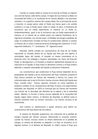 Este documento describe el número de Reynolds, que es una relación entre las fuerzas inerciales y las fuerzas viscosas en un fluido. Se utiliza para determinar si el flujo de un fluido es laminar o turbulento. El documento también describe un experimento que usa un frasco de Mariotte para medir la velocidad de salida de agua a través de tubos de diferentes diámetros y comparar los resultados con las predicciones para flujos laminares y turbulentos.