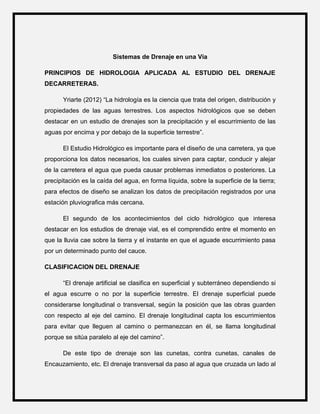 El documento describe los principios y tipos de drenaje vial. Explica que el drenaje vial tiene como objetivo alejar el agua de las carreteras para evitar daños. Describe los tipos de drenaje como superficial, longitudinal, transversal y subsuperficial. Explica que el drenaje superficial drena el agua de lluvia mientras el subsuperficial drena el agua subterránea para proteger la estabilidad de la carretera.