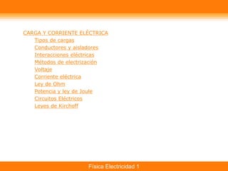 Este documento resume los conceptos fundamentales de la electricidad, incluyendo tipos de cargas, conductores y aisladores, interacciones eléctricas, métodos de electrización, voltaje, corriente eléctrica, la ley de Ohm, potencia y la ley de Joule, circuitos eléctricos y las leyes de Kirchoff. Explica estos temas a través de preguntas y respuestas, diagramas y ejemplos para proporcionar una introducción básica a estos conceptos clave de la electricidad.