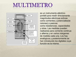 Un multímetro es un instrumento portátil que se usa para medir magnitudes eléctricas como corriente, tensión, resistencia y continuidad. Puede medir corriente continua o alterna en diferentes rangos. Explica cómo medir corriente, tensión, resistencia e intensidad y describe la diferencia entre corriente continua y alterna.