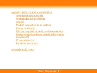 El documento trata sobre los temas de magnetismo y fuerza magnética. Explica las propiedades de los imanes, incluyendo que tienen polos norte y sur y líneas de campo magnético. También describe los efectos magnéticos de la corriente eléctrica, como la regla de la mano derecha y la fuerza de Lorentz sobre cargas eléctricas en movimiento. Finalmente, menciona algunas aplicaciones como el galvanómetro, motor eléctrico y transformador eléctrico.
