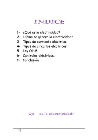 Este documento resume los conceptos básicos de electricidad. Explica que la electricidad se genera a través de la transformación de energía química, mecánica, térmica o luminosa en energía eléctrica, generalmente en centrales eléctricas. Describe los tipos de corriente eléctrica, circuitos eléctricos, la ley de Ohm y los diferentes tipos de centrales eléctricas como hidroeléctricas y térmicas.