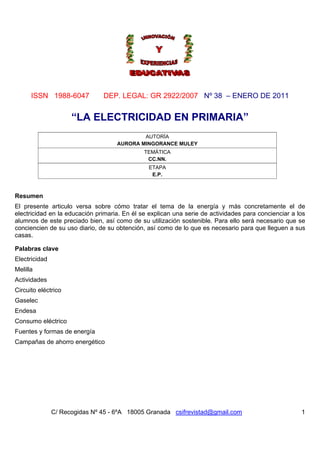 Este documento describe varias actividades para enseñar a estudiantes de primaria sobre la electricidad y su uso sostenible. Incluye explicar cómo llega la electricidad a los hogares, realizar un circuito eléctrico para demostrar las transformaciones de energía, y visitas a compañías eléctricas para entender cómo se produce y distribuye la electricidad. El objetivo es crear conciencia sobre la importancia de este recurso y promover su uso responsable.