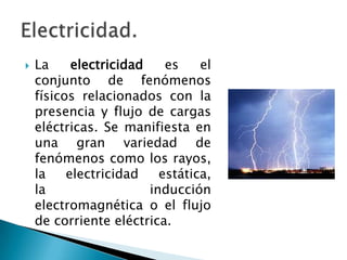 Este documento resume conceptos clave sobre carga eléctrica, corriente eléctrica y potencial eléctrico. Explica que la electricidad se produce por la presencia y movimiento de cargas eléctricas como electrones y protones. Define la corriente eléctrica como el movimiento de estas cargas a través de un material conductor, y cómo se crean campos eléctricos por cargas estacionarias que ejercen fuerzas sobre otras cargas. Finalmente, introduce el concepto de potencial eléctrico como la energía necesaria para mover