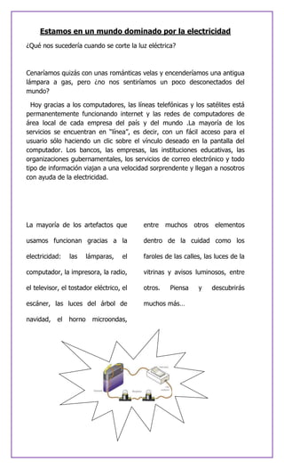 El documento describe cómo la electricidad domina el mundo moderno y cómo nos sentiríamos desconectados si se cortara la luz, ya que los servicios bancarios, educativos, gubernamentales y de correo electrónico dependen de la electricidad para funcionar a través de computadoras, teléfonos y satélites. También explica que la mayoría de los artefactos que usamos como computadoras, impresoras, radios, televisores y electrodomésticos funcionan gracias a la electricidad, al igual que las luces de las calles y vitrinas.