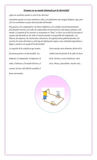 El documento describe cómo la electricidad domina el mundo moderno y cómo nos sentiriamos desconectados si se cortara la luz. La mayoría de los servicios y la información viajan a través de Internet y redes de computadoras gracias a la electricidad. Muchos artefactos que usamos diariamente como lámparas, computadoras, electrodomésticos y más funcionan con electricidad.