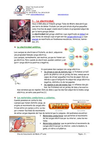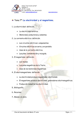 Este documento resume los principales conceptos sobre electricidad y magnetismo. Explica que la electricidad es una forma de energía relacionada con las cargas eléctricas, y describe los circuitos eléctricos, la corriente eléctrica, y los usos de la electricidad. También define el magnetismo y explica cómo la electricidad puede producir magnetismo a través de los electroimanes, y cómo el magnetismo puede producir electricidad en generadores.