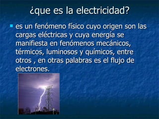 El documento describe los orígenes y desarrollo del conocimiento sobre la electricidad. Explica que la electricidad es el flujo de electrones y que científicos como Faraday y Oersted realizaron experimentos clave que demostraron la relación entre electricidad y magnetismo. También describe los principios básicos de los circuitos eléctricos, generadores, corriente continua y alterna.