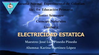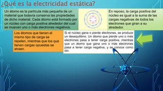 El documento describe las propiedades básicas de los átomos y la electricidad estática. Explica que un átomo está formado por un núcleo positivo alrededor del cual giran electrones negativos. La electricidad estática ocurre cuando electrones se transfieren entre átomos al contacto y separación de materiales. Los materiales pueden ser conductores u aislantes dependiendo de si permiten o no el movimiento libre de electrones.