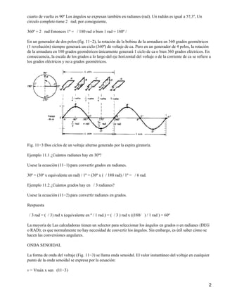 Este documento describe los principios básicos de la corriente alterna, incluyendo cómo se genera un voltaje alterno mediante un generador, la forma de onda senoidal, y conceptos como frecuencia, período, fase y fasores. Explica que un voltaje alterno cambia periódicamente su magnitud y polaridad debido a la rotación de una espira en un campo magnético, formando una onda senoidal cíclica. También define términos como ciclo, alternación, frecuencia y período para describir las variaciones