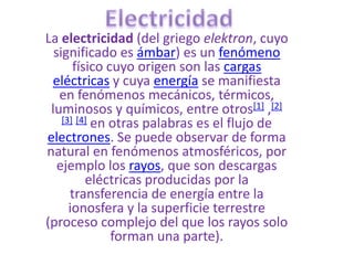 La electricidad se origina por el movimiento de electrones y la interacción de cargas eléctricas. Se manifiesta en fenómenos naturales como los rayos y procesos biológicos, y es la base del funcionamiento de máquinas y dispositivos electrónicos. Desde que Faraday descubrió cómo generar corrientes eléctricas mediante inducción, la electricidad se ha convertido en una forma importante de energía para el desarrollo tecnológico debido a su facilidad de generación y distribución.