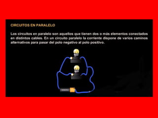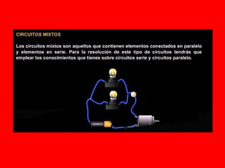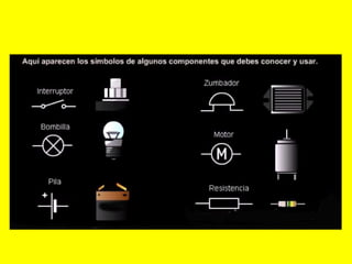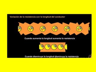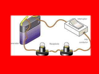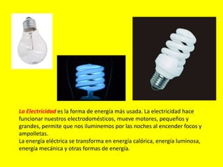 El documento explica los conceptos básicos de electricidad. La electricidad es la forma de energía más usada y se transforma en otras formas como energía calórica, luminosa y mecánica. Los átomos están formados por protones, electrones y neutrones. Los electrones pueden salirse de su órbita para formar electrones libres que permiten la corriente eléctrica a través de un circuito eléctrico que incluye un generador, conductor, interruptor y receptor. La resistencia eléctrica depende de las características del material y