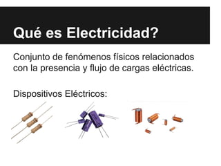 La electricidad se define como fenómenos físicos relacionados con el flujo de cargas eléctricas, mientras que la electrónica se enfoca en sistemas que controlan ese flujo. La ley de Ohm establece que la intensidad de la corriente es proporcional al voltaje, y se diferencia en que la electricidad tiene una relación lineal, a diferencia de la electrónica, que no es lineal. Además, se mencionan las leyes de Kirchhoff relacionadas con corrientes y tensiones.