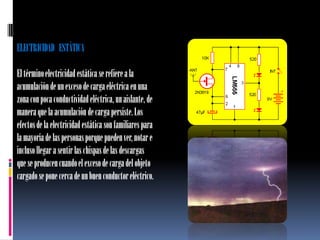 Este documento trata sobre la electricidad estática y describe cómo se genera, sus peligros y cómo se puede prevenir la descarga de electricidad estática mediante el uso de pulseras antiestáticas. Explica que la electricidad estática se produce por el movimiento entre superficies y puede dañar componentes electrónicos. También describe cómo construir una pulsera antiestática casera usando materiales como cable, resistencia y velcro para conectar el cuerpo a tierra y prevenir descargas.