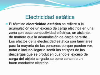 Este documento habla sobre la electricidad estática. Explica que se refiere a la acumulación de carga eléctrica en objetos aislantes y que ha sido conocido desde la antigüedad. También describe las causas de la electricidad estática y algunos peligros asociados con ella cuando hay acumulación de carga cerca de materiales sensibles. Finalmente, indica que la electrostática estudia los efectos de las cargas eléctricas en reposo.