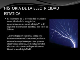 El fenómeno de la electricidad estática ha sido conocido desde la antigüedad, pero la investigación científica comenzó en el siglo XVII cuando se construyeron máquinas como el generador electrostático. En 1750, Benjamin Franklin demostró la relación entre la electricidad estática y las nubes de tormenta, y en 1832 Michael Faraday demostró que diferentes tipos de electricidad como la estática son en realidad el mismo fenómeno. La electricidad estática se produce cuando los electrones son intercambiados entre materiales por contacto o cuando ciertos crist