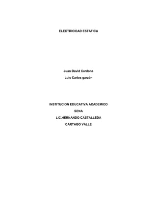 Este documento trata sobre la electricidad estática. Explica que es la acumulación de cargas eléctricas en objetos aislantes y los efectos de las descargas. También describe brevemente la historia del descubrimiento y estudio de la electricidad estática desde la antigüedad hasta el presente.