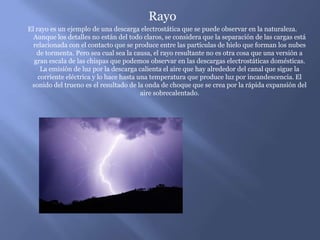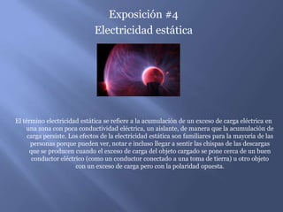 La electricidad estática se refiere a la acumulación de carga eléctrica en objetos aislantes. Puede causar chispas al descargarse y tiene efectos peligrosos como dañar componentes electrónicos sensibles, iniciar explosiones en la industria química, y representar un riesgo para dispositivos espaciales y astronautas debido a la acumulación de grandes cantidades de carga en entornos secos como la Luna o Marte. También puede provocar igniciones de vapores de combustible durante el repostaje si la desc