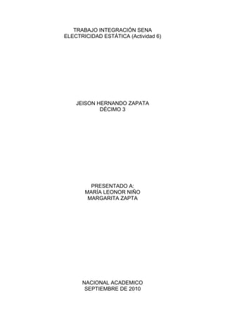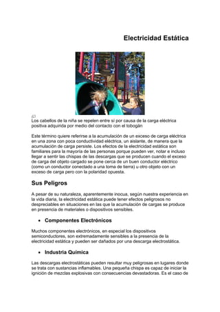 Este documento trata sobre la electricidad estática, incluyendo sus efectos, peligros y cómo se puede prevenir daños. Brevemente describe cómo se forma la electricidad estática y cómo puede dañar componentes electrónicos o iniciar fuego. También explica que las pulseras antiestáticas sirven para conducir la electricidad estática del cuerpo y prevenir descargas, y que sillas aislantes como las de plástico no deben usarse para reparar computadoras.